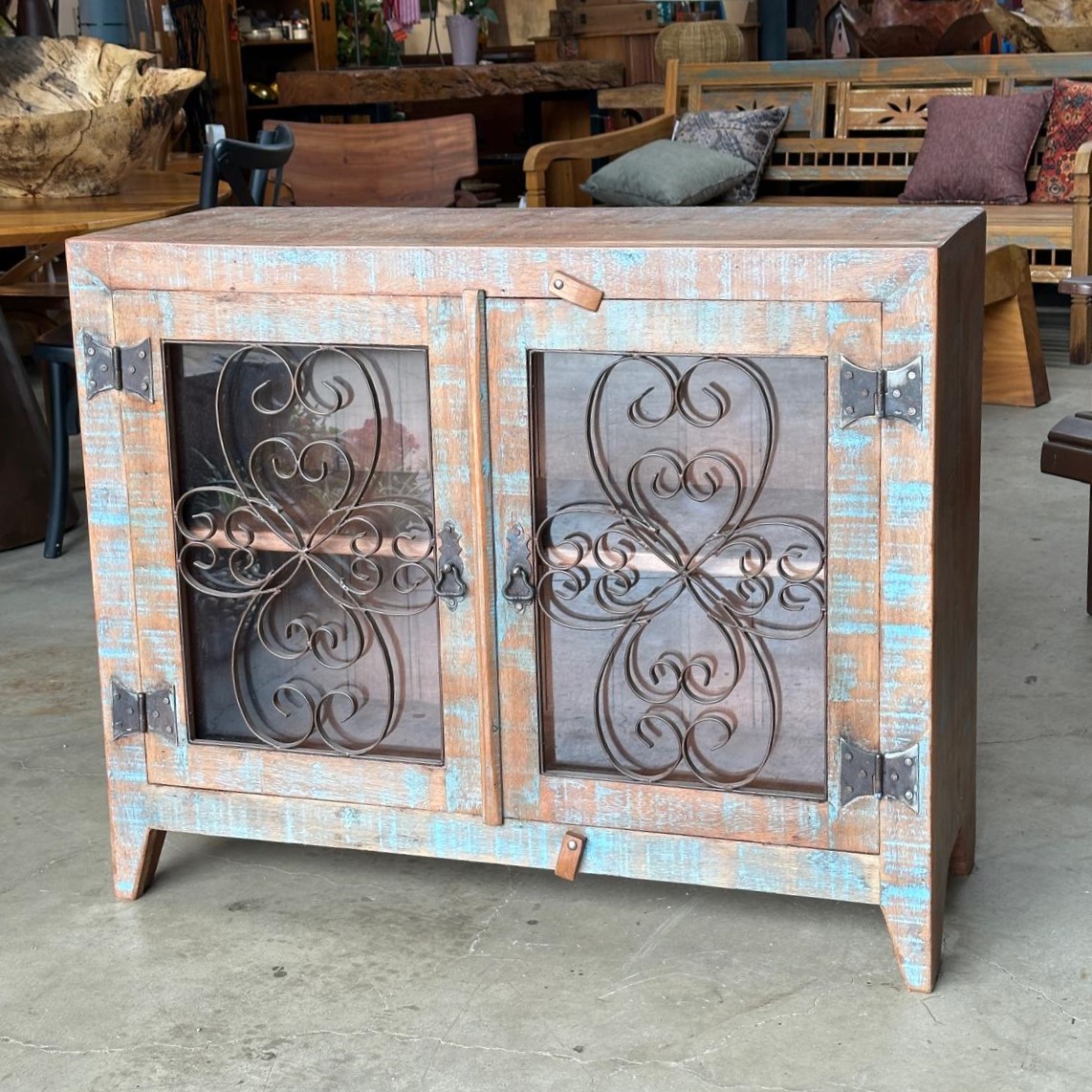 BUFFET EM MADEIRA PORTA DE VIDRO E FERRO