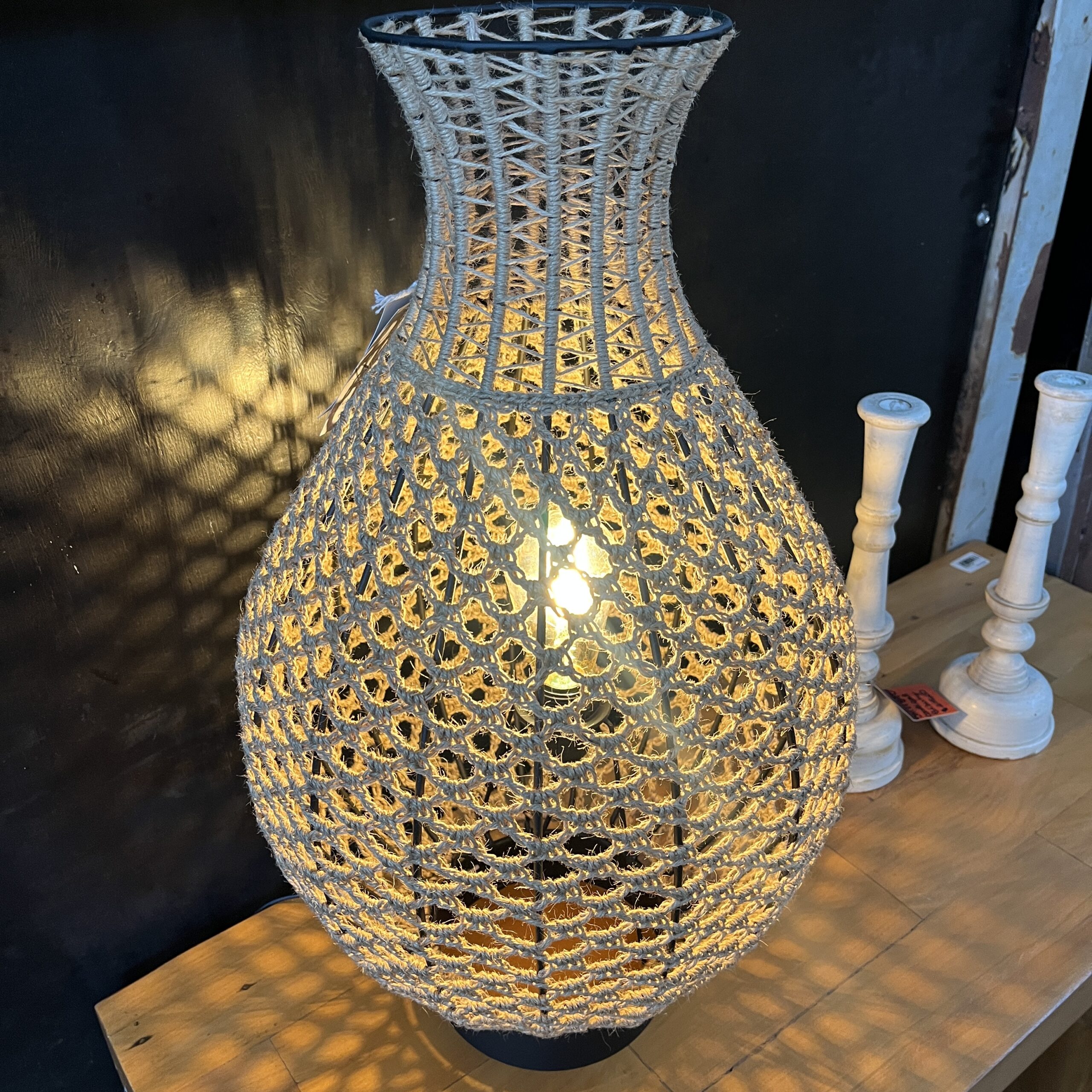 Luminária feita e ferro e tricô de sisal um produto da artista Simone Oliveira