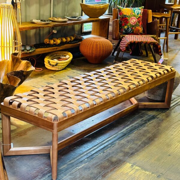 BANCO RECAMIER EM MADEIRA TRANÇADA EM COURO NATURAL